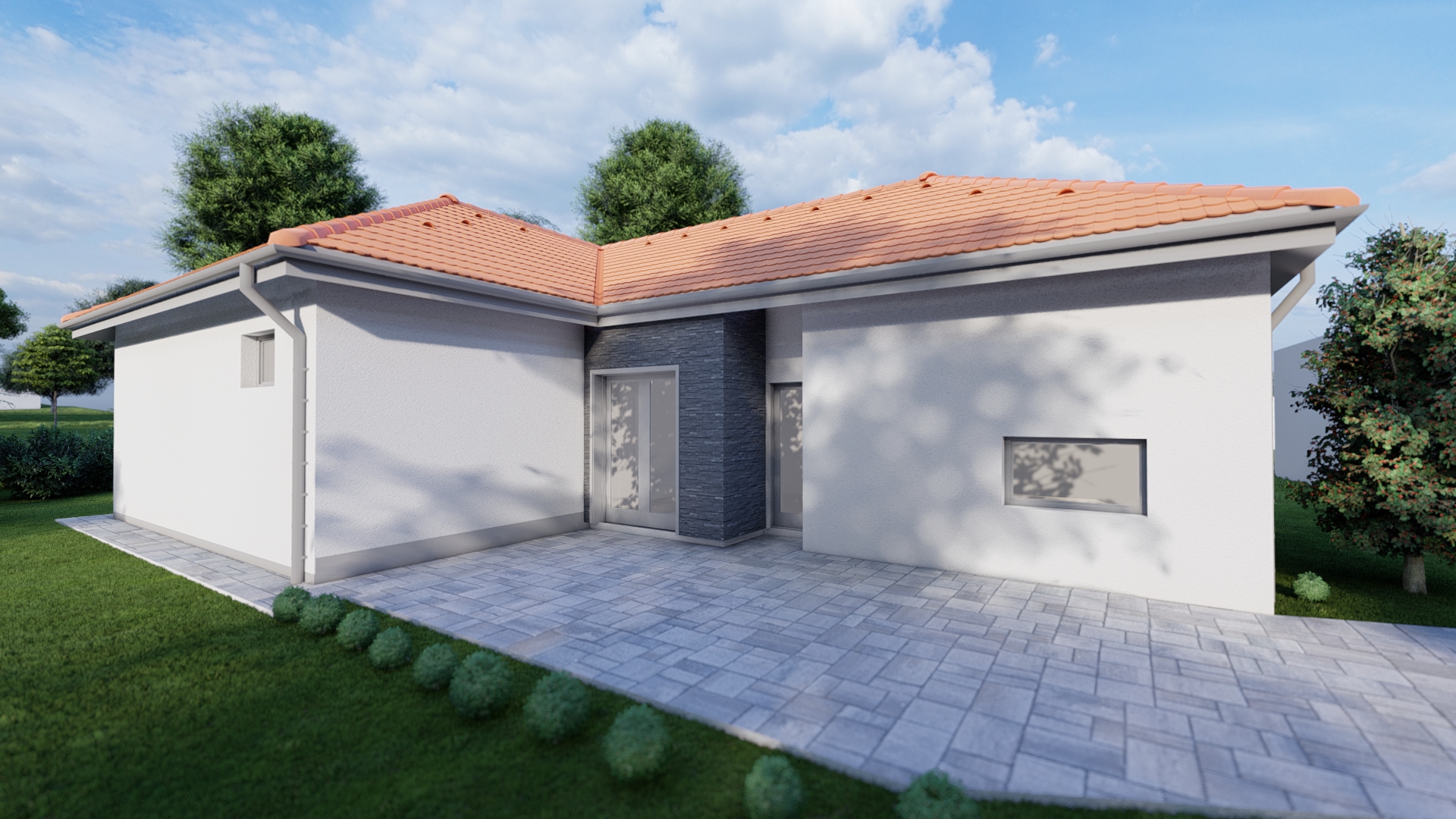 100 m² hasznos alapterületű, lapostetős családiház, nagy déli üvegfelületekkel és fix árnyékolókkal a minimális energia igény elérése érdekében.